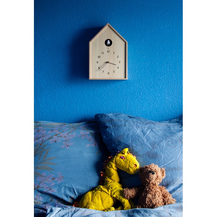 はっきりと見やすい数字フォントや、金属でできた時計の針がアクセントに。ライトセンサー機能付きで、就寝時など消灯時には小鳥もお休み。音の心配もありません。