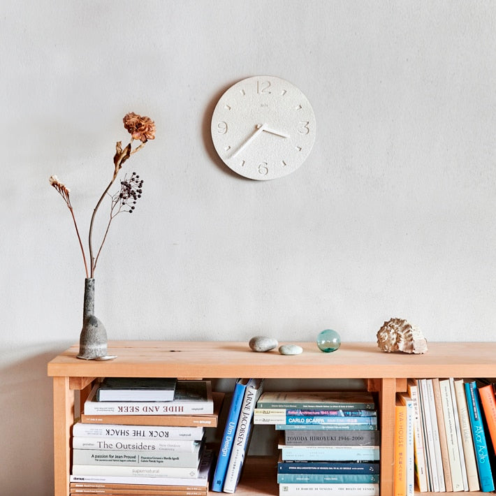日本の伝統技能「左官」の技術を用いて作られた、珪藻土の時計。