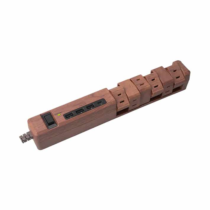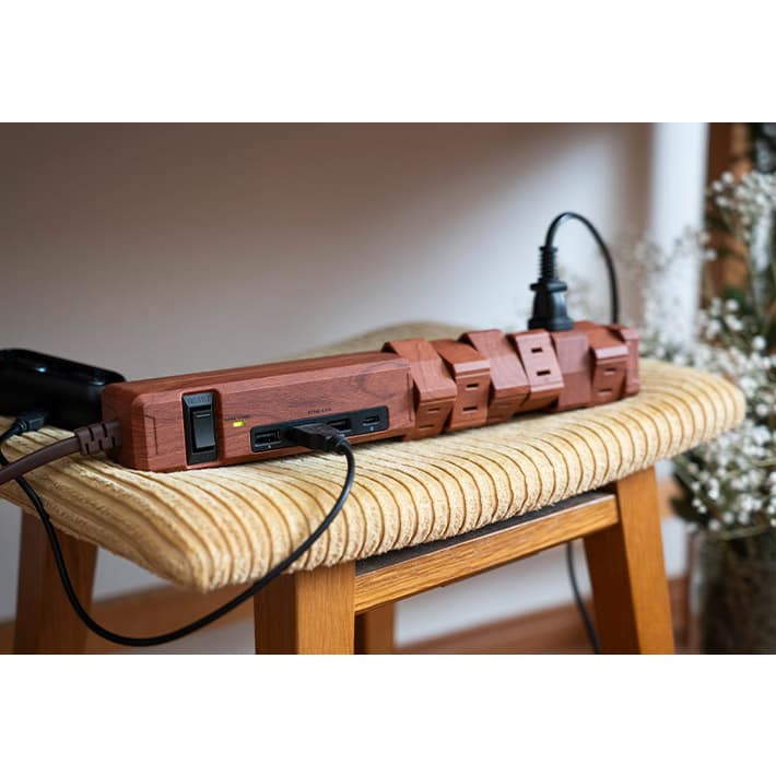 機能性とインテリア性を併せ持つ、木目調の回転式電源タップ。