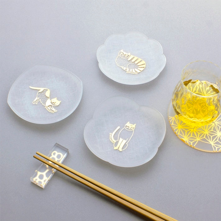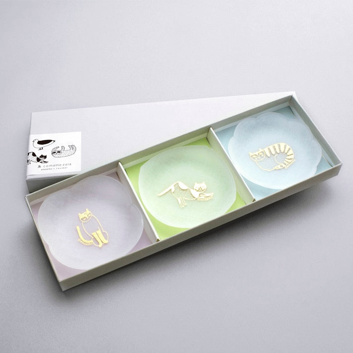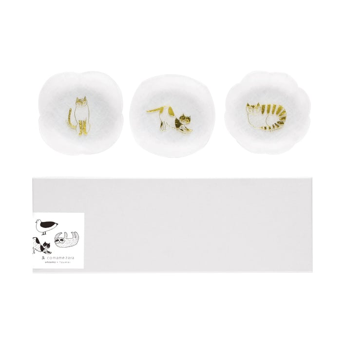 画家・神谷可奈子が描く表情豊かな動物たちを金色の箔で表現した、小さな豆皿の3枚セット。