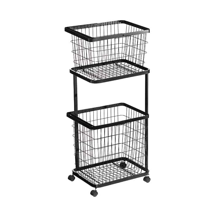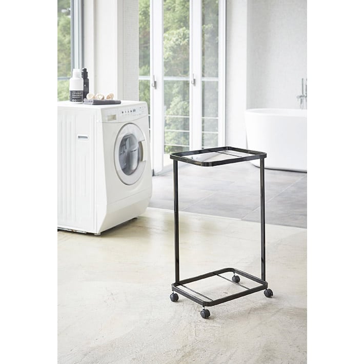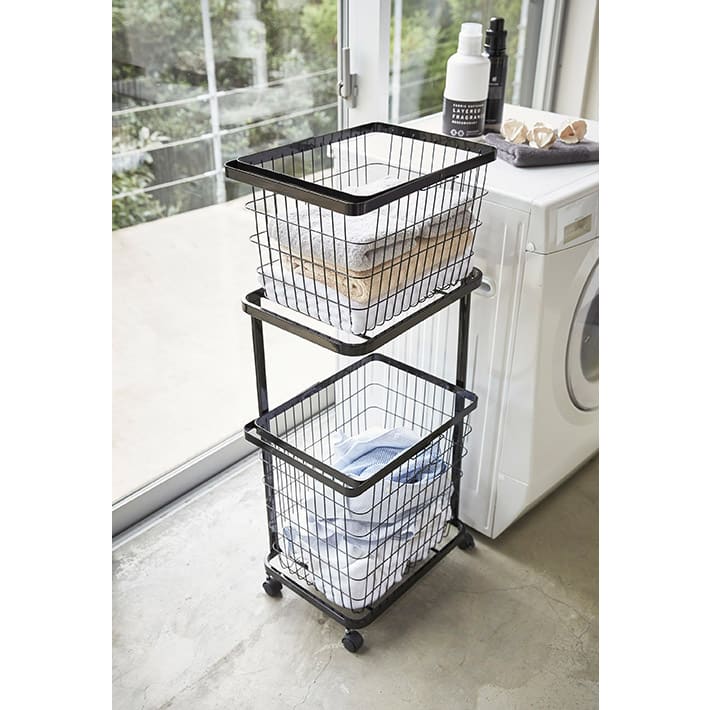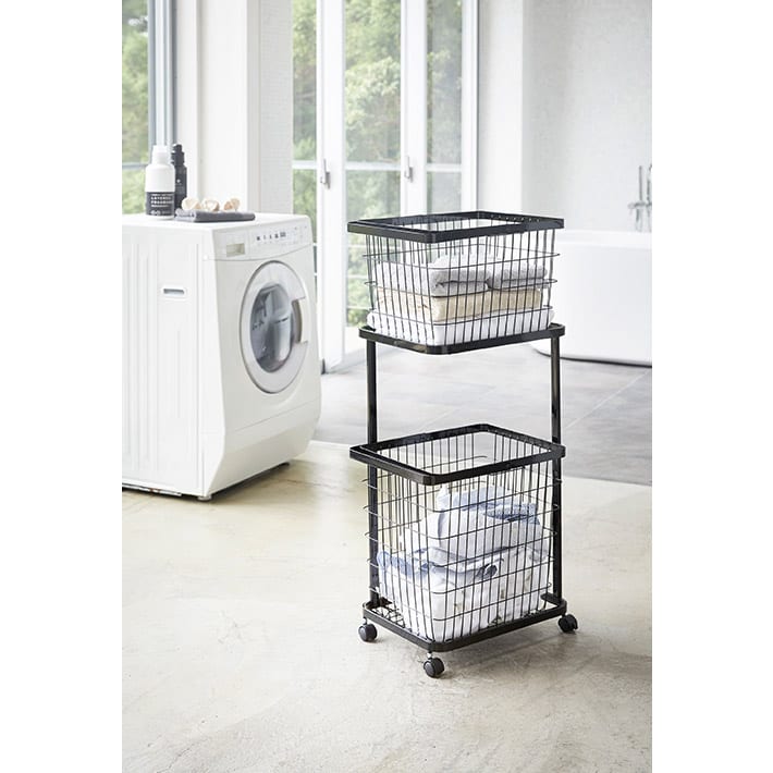 シンプルでスタイリッシュなランドリーワゴンとバスケット。スチールの素材感を活かしたデザインで、すっきりとした印象に。縦置き、横置きでもバスケットが取り出しやすく、キャスター付きで移動もできるので、お掃除のときにも便利です。